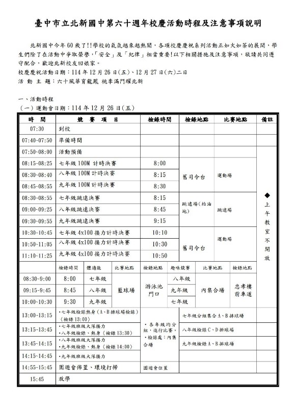 臺中市立北新國中第六十週年校慶活動時程及注意事項說明 北新國中今年60歲了!!學校的氣氛越來越熱鬧,各項校慶慶祝系列活動正如火如荼的展開,學生們除了在活動中爭取榮譽,「安全」及「紀律」相當重要!以下相關措施及注意事項,敬請共同遵守配合,歡迎北新校友回娘家。 校慶慶祝活動日期:114年12月26日(五)、12月27日(六)二日 活 動 主 題:六十風華育龍鳳 桃李滿門耀北新