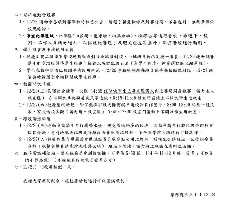 二、關於運動會競賽 1、12/26運動會各項競賽賽程時程已公告,請選手留意檢錄及競賽時間,不要遲到,無故棄賽依校規處份。 2、淨空比賽區域,比賽區(田徑場、籃球場、內集合場)、檢錄區等進行管制,非選手、裁判、工作人員請勿進入,以保護比賽選手及避免碰撞等意外,維持賽程進行順利。 三、學生服裝及手機使用規範 1、校慶活動二日須穿學校運動服或制服或班服到校,由班級自行決定統一服裝,12/26運動競賽選手若穿班服須持學生證進行檢錄以確認班級姓名(無學生證者一律穿運動服且繡學號)。 2、學生在校時間依照校園手機使用規範,12/26學務處發給每班3張手機拍照識別證,12/27開幕典禮後園遊會期間開放學生拍照。 四、校園開放時段 1、12/26(五)為運動會競賽,8:00~14:55僅開放學生父母或監護人到比賽場周邊觀賽(請勿進入教室區),亦不開放其他親屬及民眾進校,8:15~11:40教室門窗鎖上不開放學生進教室。 2、12/27(六)校慶慶祝活動,除了擺攤班級或攤商提早進校卸貨佈置外,8:00~13:00開放一般民眾、家長進校參觀(請勿進入教室區),7:45~12:30教室門窗鎖上不開放學生進教室。 五、環境清潔維護 1、12/26(五)運動會請學生自行攜帶水壺,避免製造過多的垃圾,活動中請自行將垃圾帶回教室回收分類,勿隨地亂丟垃圾或將垃圾丟在廁所垃圾桶,下午放學前各班進行打掃工作。 2、12/27(六)將於內集合場園遊會區域設置3處定點公用垃圾桶,敬請配合將垃圾、回收物妥善分類(紙餐盒餐具請先沖洗後再回收),垃圾不落地,請勿將垃圾丟在廁所垃圾桶。 六、稅務常識補給站:當天稅務局會到校設攤,可準備5~50張「114年11~12月統一發票」可以兌換小獎品喔! (手機載具內的電子發票亦可) 七、12/29(一)校慶補假一天。