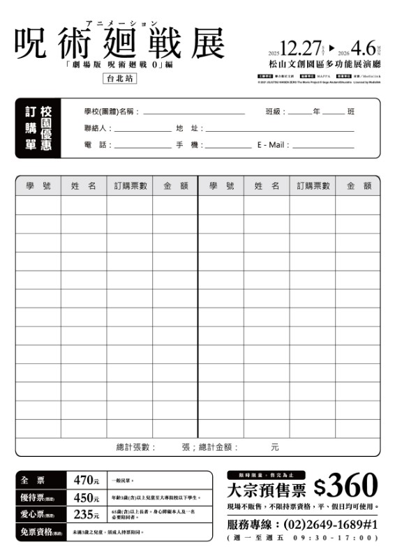 轉知聯合數位文創股份有限公司訂於114年12月27日~115年4月6日於台北市松山文 創園區多功能展演廳舉辦「咒術迴戰展《劇場版 咒術迴 戰 0》篇」(收費性質)