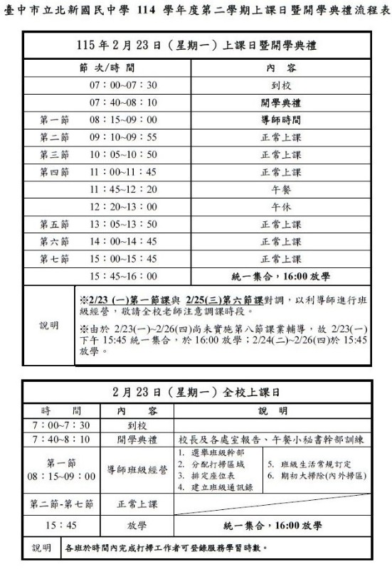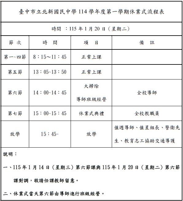 115年1月20日(星期二)第七節:114年度第一學期休業式 115年1月21日(星期三)至115年1月23日(星期五):提前上114學年度第二學期課程 115年2月23日(星期一)7:40於內集合場舉行114學年度第二學期開學典禮 ※流程表請點選下方有顏色文字開啟PDF檔。 114年度第一學期休業式流程表 (點選文字開啟PDF檔)