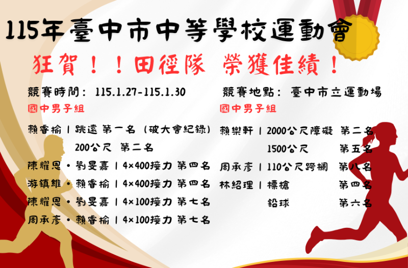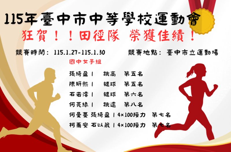 本校田徑隊參加115年臺中市中等學校運動會 1金2銀 佳績