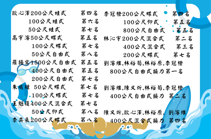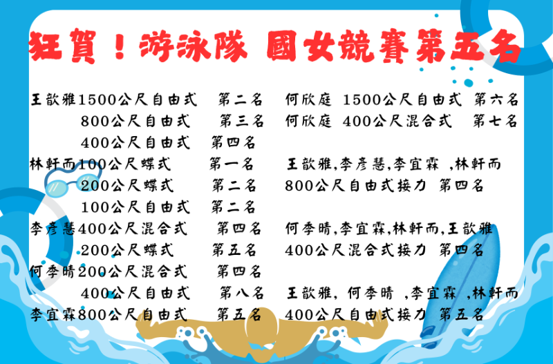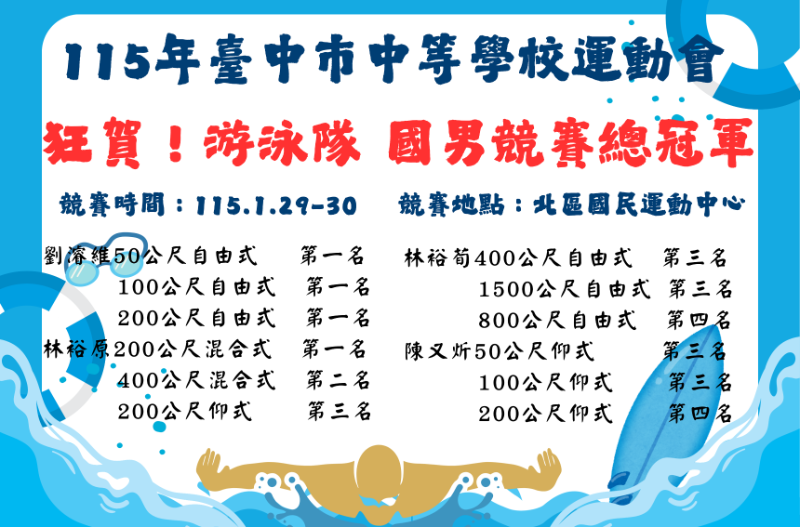 本校游泳隊 參加115年臺中市中等學校運動會 榮獲 10金9銀7銅 國男組競賽總冠軍 國女組經賽第五名