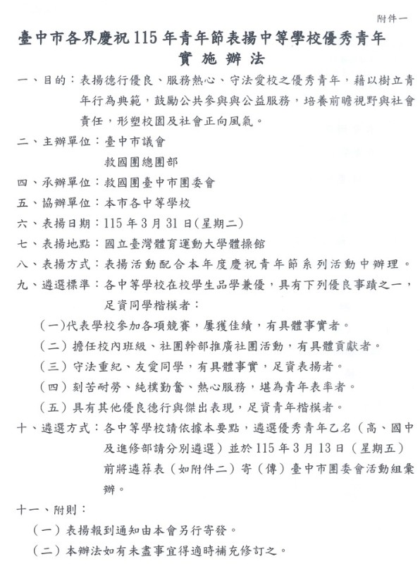 | 標題 | 115青年節表揚中等學校優秀青年實施辦法 |
