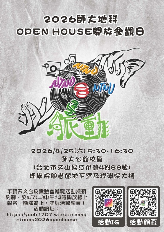 主旨:本校地球科學系訂於本(115)年4月25日(星期六)於本校公館校區舉辦「2026師大地科開放參觀日」,敬請協助公告周知,並鼓勵貴校師生踴躍參與,請查照。 說明: 一、為推廣地球科學教育並引發學生對自然科學之學習興趣,本校地球科學系特辦理「2026師大地科開放參觀日」,結合互動體驗、實境解謎與研究展示,提供一場兼具知識性與趣味性的學習活動。 二、本活動特色為結合「探索任務」與「真實研究」,內容包含: (一)實境解謎闖關活動:以主題式情境設計串聯各展區關卡,結合故事導向之任務,引導學生於解謎過程中探索地球科學知識與實際應用。內容包含: 1、科普互動展區(系展)關卡:由大學部規劃,以「脈動(SIGNALS)」為展覽主題,呈現地球內部至大氣與宇宙之跨尺度科學現象,並透過展示與互動教具,引導學生直觀理解地球科學重要概念。 2、研究導向關卡:由研究生團隊介紹教師研究方向與實驗室成果,並結合地球科學相關升學與職涯發展說明,帶領學生認識地球科學前沿研究及未來發展方向。 3、完成闖關者可參加抽獎活動,以提升參與趣味與學習動機。 (二)實驗室與天文台導覽(限額報名):開放參觀校內貴重儀器實驗室及天文觀測設施,提供難得之學習機會(本項活動因空間限制採線上預約報名)。 三、本活動透過沉浸式體驗設計,引導學生由科普知識延伸至真實研究情境,有助於深化學習動機,並協助其探索未來升學方向。 四、活動資訊如下: (一)活動時間:115年4月25日(星期六)9時30分至16時30分 (二)活動地點:國立臺灣師範大學公館校區(詳細地點請參見活動網站) (三)報名方式: 1、活動自由參加 2、實驗室導覽採線上報名(115年4月7日中午12時開放報名),並以高中生優先錄取。報名方式詳見活動網站。 五、敬請貴校協助公告並鼓勵老師學生踴躍參與,以拓展學習視野並提升科學素養。 六、聯絡資訊: (一)聯絡人:林純綿小姐 (二)電話:02-7749-6375 (三)電子郵件:esadmin@ntnu.edu.tw (四)主辦單位:本校地球科學系 (五)活動網頁:https://youb1707.wixsite.com/ntnues2026openhouse(詳細活動內容及報名方式請參閱活動網頁)