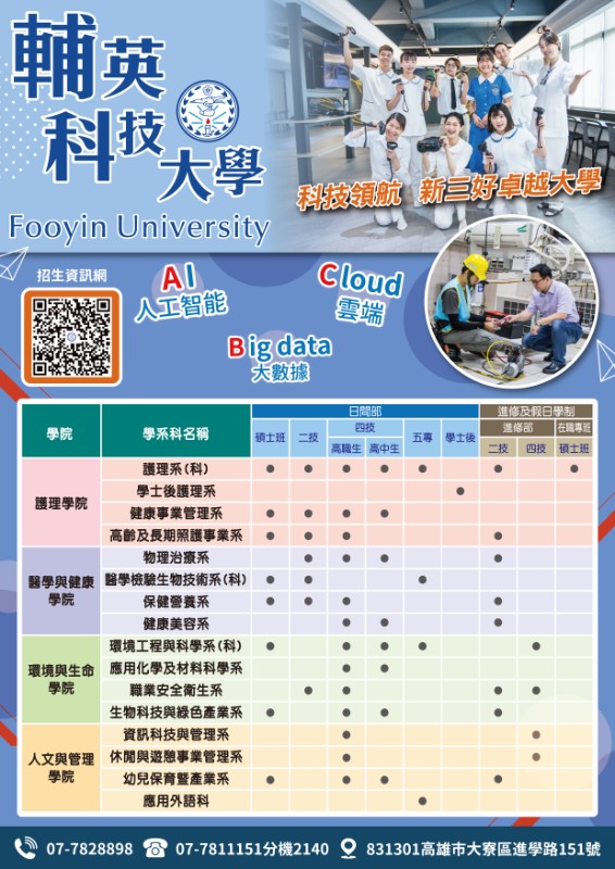 說明:一、本校學制規劃完整,設有五專、二技、四技、碩士班及學士後護理系等學制,未來出路多元亦具發展性。二、本校校園環境優美,食宿設施齊全,公車直接駛入校園交通便捷,另設有多處經政府認證之專業技術鑑定試場,並獲高雄市政府委託本校經營之大寮運動中心,讓學子們能在俱備專業特色及健康安全的環境下學習。三、有關升學進路、學系科介紹、報名資格等入學相關問題,歡迎電洽招生暨入學服務中心,將由專人提供諮詢。