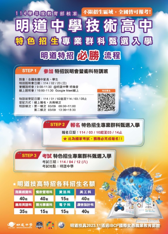 說明:一、本校特色招生專業群科甄選入學(技高特招)各項招生訊息,請上本校網站查詢。https://sites.google.com/ms.mingdao.edu.tw/mdvhs- 1/%E7%89%B9%E6%8B%9B%E5%B0%88%E5%8D%80 (一)各科招生名額:資訊科15人、電子科15人、美工科40人、廣告設計科40人、餐飲管理科40人、觀光事業科15人、商業經營科40人、應用英語科35人,合計招生人數240名。 (二)報名日期:114年3月10日(星期一)~114年3月14日(星期五)。 (三)術科測驗日期:114年4月12日(星期六)。二、為讓學生及家長能更瞭解本校各科之辦學特色,本校訂於114年2月23日(星期日)舉辦實體暨線上招生說明會,竭誠歡迎家長與學生踴躍參加。三、為讓同學了解術科測驗之內容,於3月9日(星期日)辦理術科測驗特訓班,歡迎同學踴躍報名參加。報名網址:https://s46.mingdao.edu.tw/ORS2/Web/