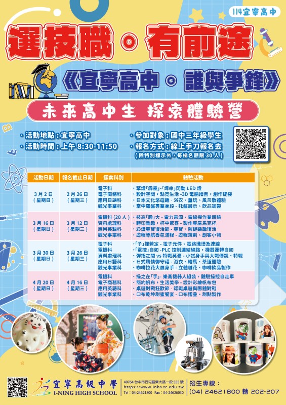一、檢附活動海報,請參閱。。二、活動時間:114年4月20日(星期日);活動地點:宜寧高中五樓閱覽室。三、報名方式:採網路(請掃描海報QR Code)報名,或撥打招生專線04-24621800分機202~207;報名截止日詳如活動海報。