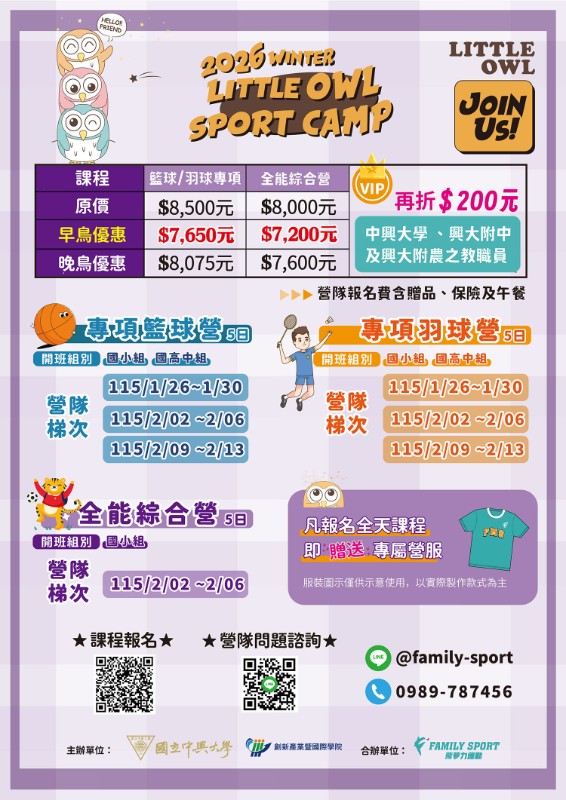 課程目的:為培養學童運動興趣、強化體適能表現,並提供優質安全之運動學習環境,本校規劃辦理「2026運動冬令營」,開設籃球、羽球專項訓練及全能運動主題營隊,由專業師資授課。 |