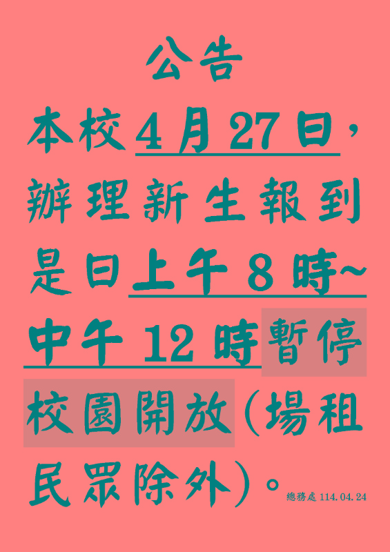 | 標題 | 114年4月27日 8:00-12:00 校園場地暫停開放公告 |