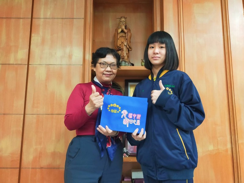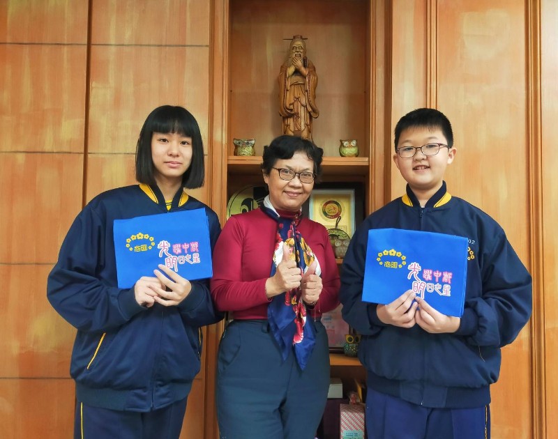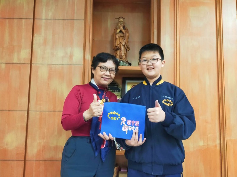 左起:910林沛恩、胡金枝校長及701杜宥融合照。