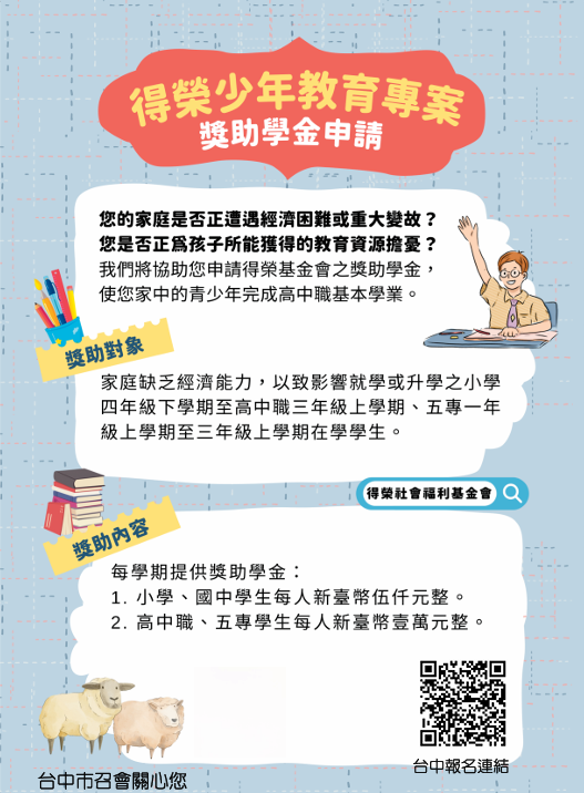 申請資格1.家庭缺乏經濟能力,以致影響就學或升學之中小學。2.申請前須完成八次生命教育課程,並於審核通過後,始稱為得榮少年,得領取本會提供之獎助學金,並須參與得榮少年相關活動。