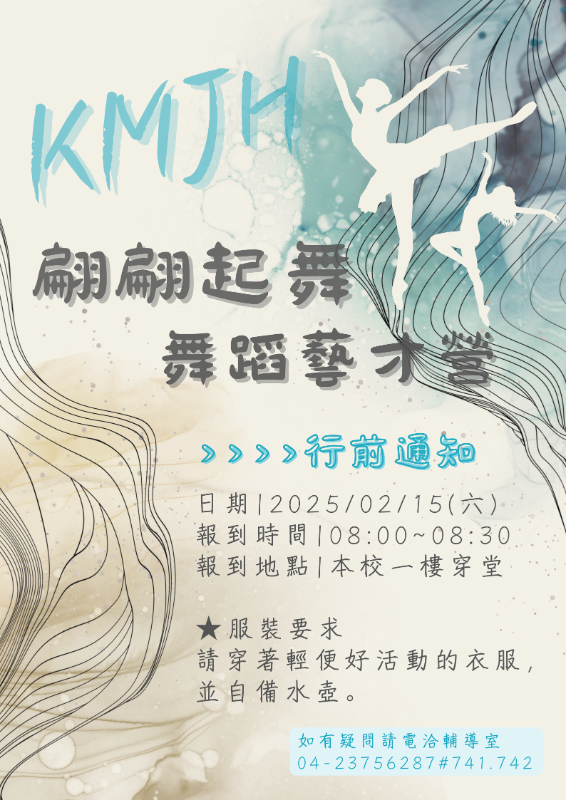 113學年度本校舞蹈藝才營於114.2.15日(六)上午進行,相關流程表及分組名單如附件 有任何問題請洽本校輔導室