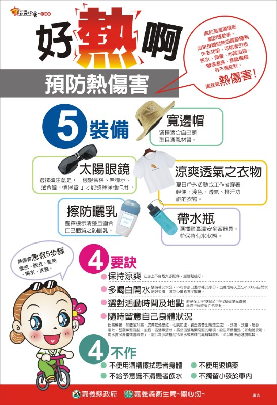 近年受氣候變遷影響造成氣溫偏高 ,若無適當防護措施任何人都有可能會發生熱傷害,尤其是嬰幼童、高齡者(如長照機構、居家、獨居)、慢性病者、戶外活動者(如運動員、外送人員等)等族群,更容易因高溫而造成熱傷害。 為強化中央與地方政府高溫熱傷害整備防救能力及易受傷害 族群之多元關懷措施與管道, 提醒民眾在夏日高溫時,應注意避免或減少曝曬於高溫環境 下,並保持「涼」爽、「補」充水分及提高警覺「心」, 以預防熱傷害的發生。 |