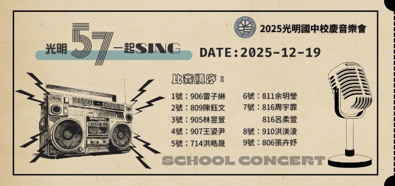 | 標題 | 2025校慶音樂會【光明57一起SING】比賽順序公告 |