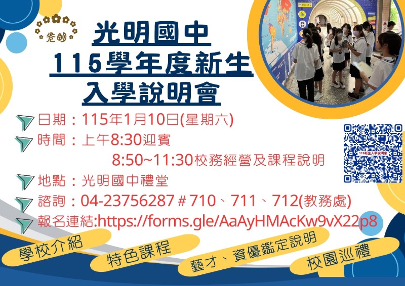 歡迎即將於115學年度入學國中的小六新生與家長們,一同走入光明校園,深度了解光明!!日期:115年1月10日(星期六)時間:上午9:00~11:00地點:光明國中禮堂報名連結:https://forms.gle/wgHe3Hy1MAYXGqsh9當日提供停車空間:汽車請由公館路46巷(光明國中後側門)進入,機車請由正門進入。新生入學聯絡與諮詢:04-23756287教務處#710、711、712