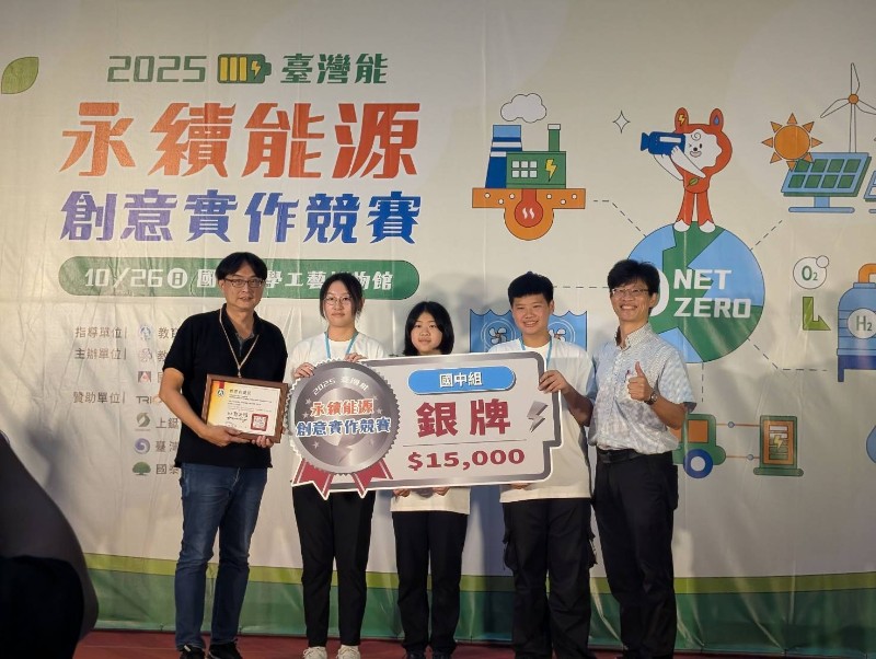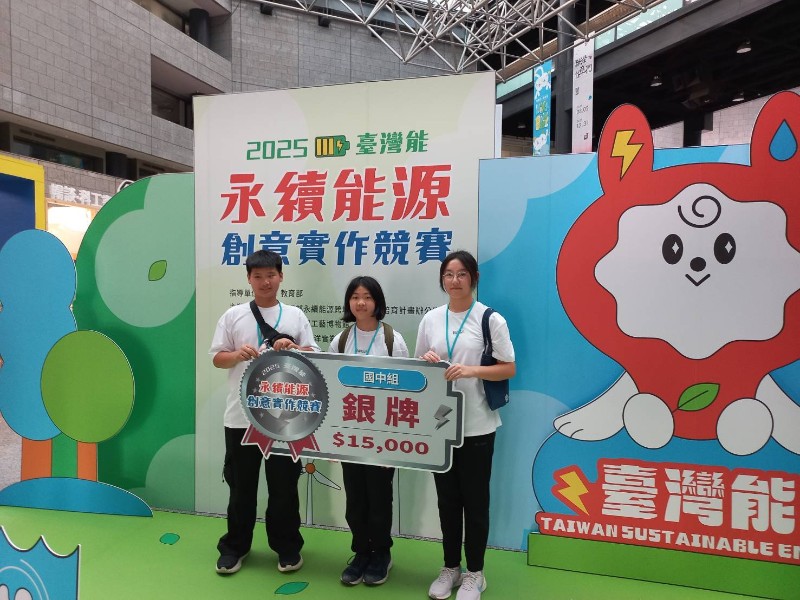 賀!本校806粘元隆、林珈羽、黃湘芸參加2025年臺灣能-永續能源創意實作競賽榮獲銀牌!感謝高佳新老師辛勤指導。