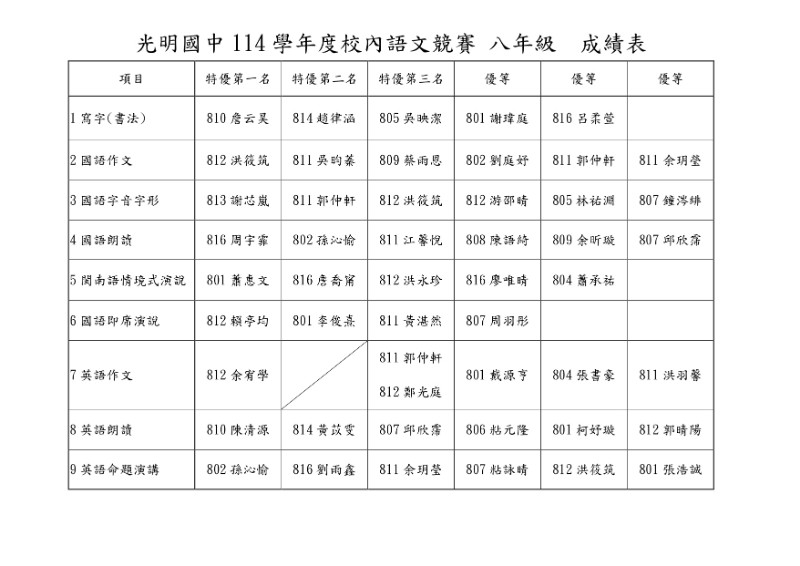 光明國中114學年度校內語文競賽八年級 成績表