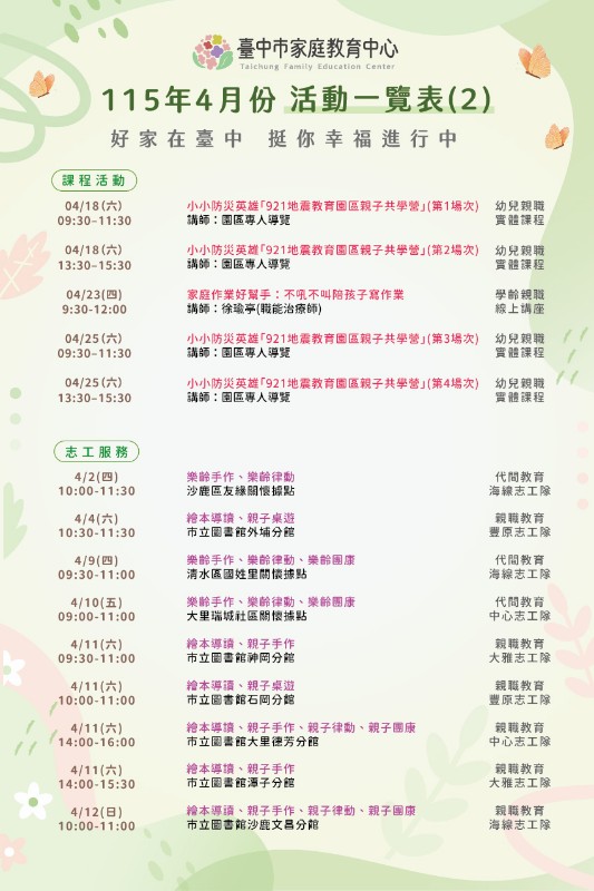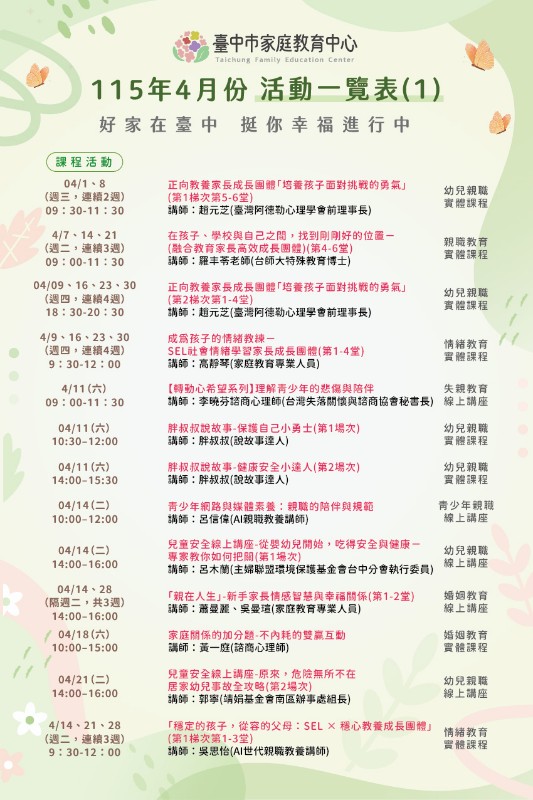 臺中市家庭教育中心115年4月份活動一覽表
