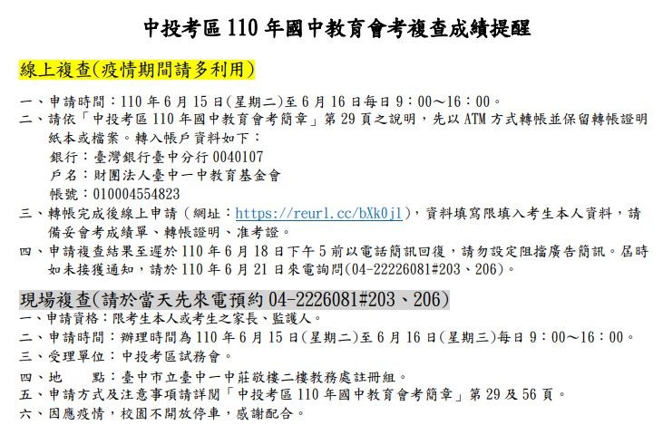 三、中投區教育會考成績複查相關注意事項如下圖: