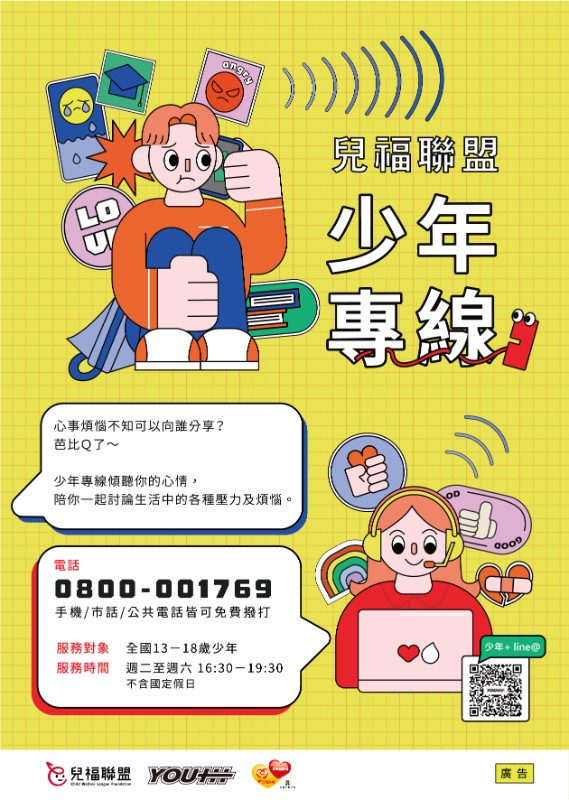 本會辦理「兒福聯盟-少年專線服務(0800-001769)」,提供全台12歲至18歲之少年免付費電話諮詢服務,服務時間為每週二至週六下午4:30至7:30。期待透過此專線傾聽少年的需求,協助其抒發壓力,並引導、陪伴他們面對和解決困難。 |