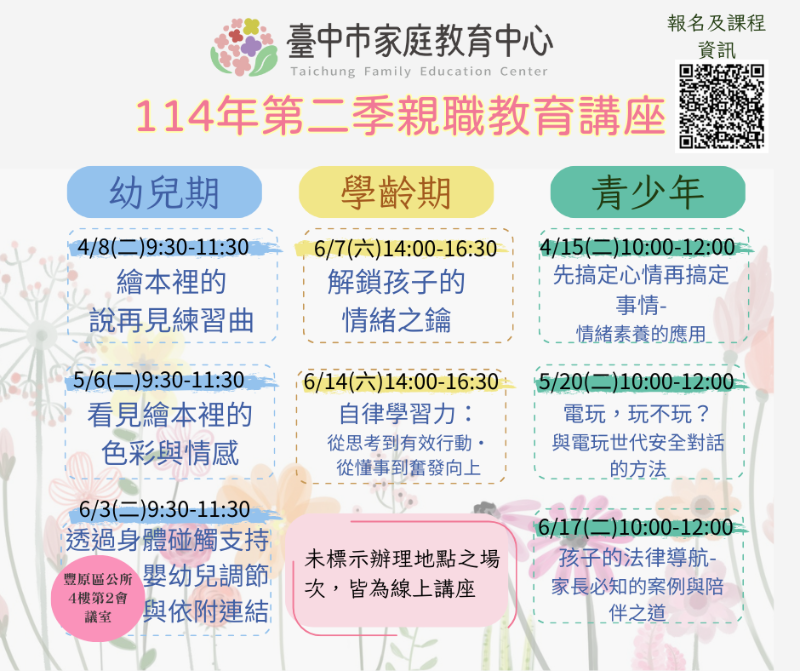 請貴機關、學校協助將旨揭課程訊息發布官方網頁及各類網路媒體平台,鼓勵所轄及民眾踴躍參加,另請協助轉知所轄單位及所屬(如各區親子館曁Mini親子館、家庭福利服務中心、圖書館分館、藝文中心、婦女及新住民培力中心、新住民藝文中心、原住民族家庭服務中心等)分享課程訊息,宣傳方式包含各轄LED電視牆、室內站立式海報機或市立圖書館自動借閱機之電子螢幕等設備,亦可直接分享本中心官網或臉書專頁貼文之連結(網址: https://reurl.cc/Dq6VEO、https://reurl.cc/qn6rVR、https://reurl.cc/AMRv6Y、https://reurl.cc/M3kK2L) 。 |