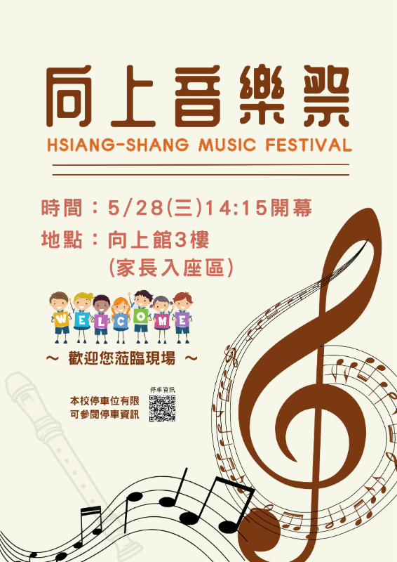 ※時間:114年5月28日(三) 14:15~16:55 ※地點:家長請至[向上館3樓]入座 一、第六節:開場表演(管樂團) 二、校長致詞 三、表演開始 (一)第六節(14:15~15:00):206、201、208 ~ 下課(15:00~15:15)~ (二)第七節(15:15~16:00):211、205、204、207、203 ~ 下課(16:00~16:10)~ (三)第八節(16:10~16:55):212、210、202、213、209 歡迎家長入校觀賞, 邀請您蒞臨欣賞。(請出示邀請函圖示入校)