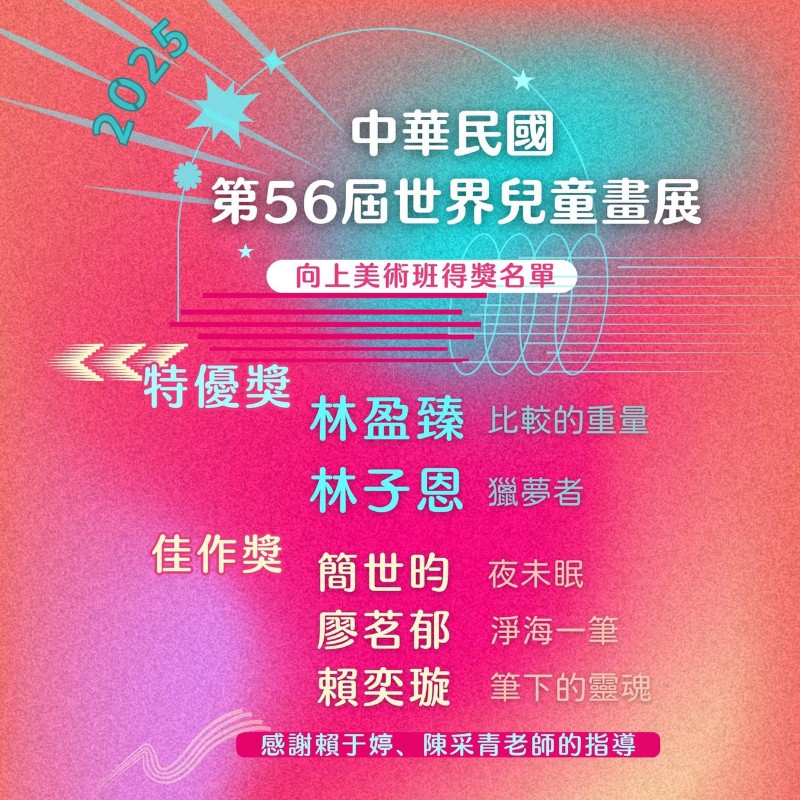 賀!本校 美術班學生 參加「中華民國第56屆世界兒童畫展-複賽」榮獲佳績!得獎同學有: 1.特優獎:312林O臻、林O恩 2.佳作獎:213簡O昀、賴O璇,116廖O郁 感謝賴于婷、陳采青老師的指導。 |