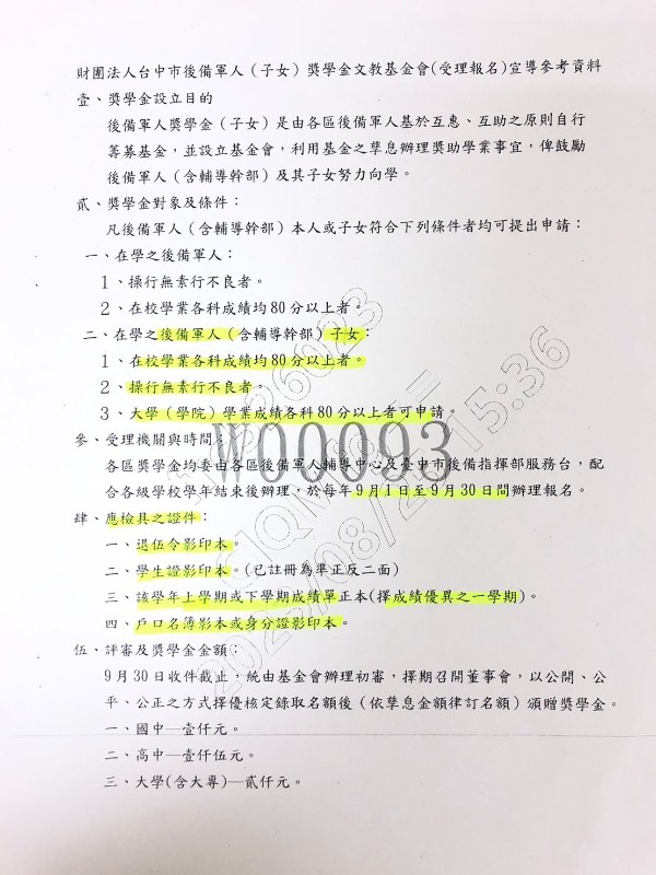 轉知財團法人台中市後備軍人(子女)文教基金會獎學金,請符合資格之後備軍人或在學之後備軍人子女申請