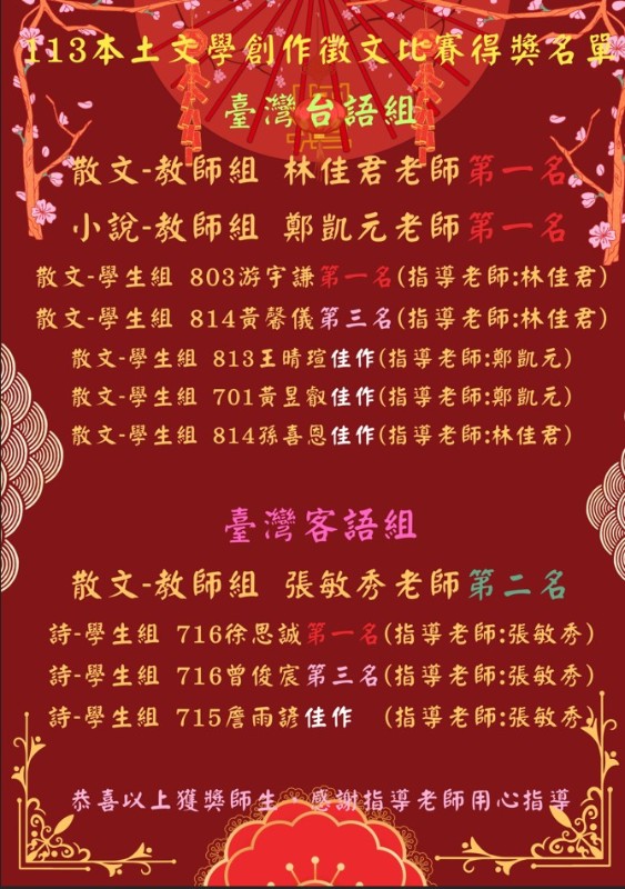 113本土文學創作徵文比賽得獎名單