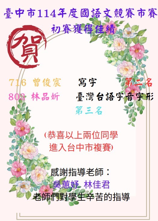 臺中市114年度國語文競賽市賽初賽獲得佳績