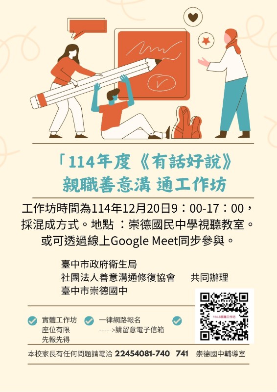 說明: 一、 善意溝通修復協會是公益性社團法人,長期關注孩子的社交情緒教育、心理健康、校園衝突修復、家庭關係。 二、 每年定期辦理免費《有話好說》親職教育工作坊,除講授觀念知識外,並有兩小時分組實際演練。 三、 由台中市衛生局擔任共同辦理單位,補助部分講師費用。崇德國中共同辦理提供場地。四、 工作坊時間為114年12月20日9:00-17:00,採混成方式,實體地點於臺中市北屯區崇德國民中學,其餘縣市可透過線上Google Meet同步參與。