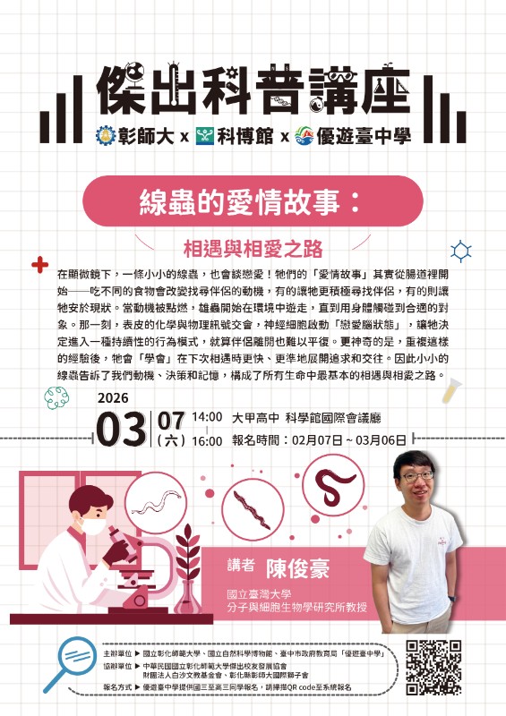 一、 依據臺中市114學年度高級中等學校課程發展中心實施計畫辦理。二、 臺中市教育局114學年度與國立彰化師範大學、國立自然科學博物館合作,共同辦理12場傑出科普講座,為擴大學習資源之運用,推廣科普教育,特開放教師、民眾共同參與。三、 講座資訊如下:(一) 主講者:陳俊豪教授(國立臺灣大學分子與細胞生物學研究所)(二) 講題:線蟲的愛情故事-相遇與相愛之路(三) 講座時間:115年3月7日(星期六)下午2時至4時(四) 講座地點:臺中市立大甲高級中等學校科學館國際會議廳(五) 教師進修網研習代碼:5509309(六) 承辦學校:臺中市立大甲高級中等學校四、 全程參與教師授予2小時研習時數。