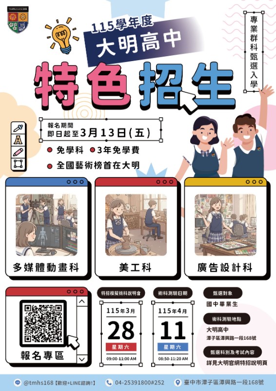 說明:一、重要日程如下:(一)特色招生術科測驗報名:3月9日(星期一)至3月13日 (星期五)。(二)特色招生模擬術科說明會:3月28日(星期六)。(三)特色招生術科測驗:4月11日(星期六)。(四)特色招生術科成績公告:5月18日(星期一)(五)特色招生放榜:6月11日(星期四)(六)特色招生報到:6月12日(星期五)二、115學年度本校特色招生名額如下:(一)廣告設計科:25名。(二)美工科:25名。(三)多媒體動畫科:25名。三、術科測驗簡章、測驗內容及實作範例影片請至本校特色招生專區查詢(https://vvrl.cc/tw/okmmd6)。四、報名費用:免收報名費。五、聯絡電話:04-25391800#250(招生處)、202(註冊組)