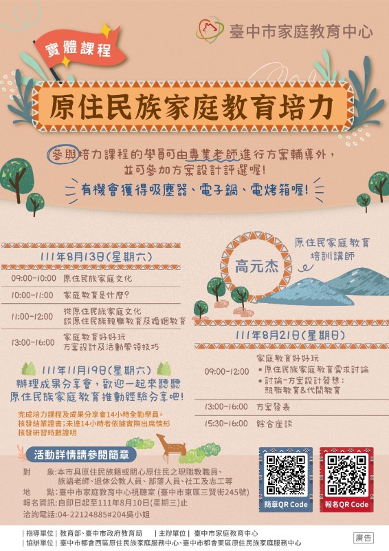 臺中市家庭教育中心辦理111年度原住民族家庭教育培力實施計畫及DM各乙份 活動相關資訊如下: (一)時間:111年8月13日(星期六)、111年8月21日(星期日)上午9時至下午4時。 (二)地點:臺中市家庭教育中心(臺中市東區三賢街245號)。 (三)參與對象:本市具原住民族籍或關心原住民之現職教職員、族語老師、退休公教人員、部落人員、社工及志工等。 (四)活動內容:從原住民族家庭文化了解家庭教育、原住民族親職教育及婚姻教育,並學習原住民族家庭教育方案設計及活動帶領技巧,將原住民族傳統文化融入家庭教育,達到文化傳承的使命,並讓原住民族家庭更和諧。 (五)講師:高元杰老師(新北市原住民家庭教育種子師資培訓講師、多元文化教育及原住民族語教材教法培力講師)。 (六)報名網址:https://forms.gle/J8SBSrkuPafFK6bN7,自即日起至 111年8月10日(星期三)止。 (七)成果分享會及研習證明: 1、111年11月19日(星期六) 辦理成果分享會,共同了解原住民族家庭教育推動經驗。 2、完成培力課程及成果分享會14小時全勤學員,核發結業證書;未達14小時者依據實際出席情形核發研習時數證明 (八)方案輔導及方案評選:參與培力課程的學員可由專業老師進行方案輔導外,並可參加方案設計評選,有機會獲得吸塵器、電子鍋、電烤箱。 (九)因應新冠肺炎疫情,本案落實各項防疫規範及措施,入場時應全程佩戴口罩並量測額溫,倘有發燒(額溫37.5°C;耳溫38°C)、呼吸道症候或腹瀉等情形,不得進入,並儘速就醫治療。