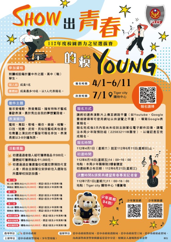 轉臺中市政府警察局112年度校園潛力之星選拔賽~「Show出青春的模Young」活動計畫、報名簡章及活動海報各1份,請學生踴躍報名參加。