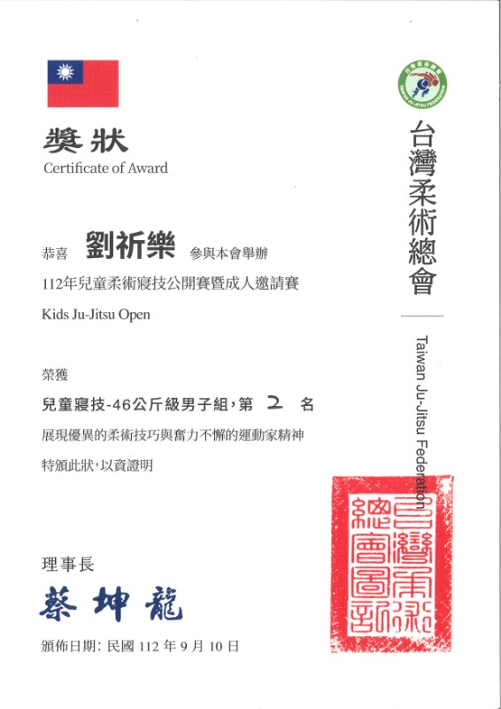 恭喜103劉祈樂同學參加台灣柔術總會112年兒童柔術寢技公開賽榮獲第2名。