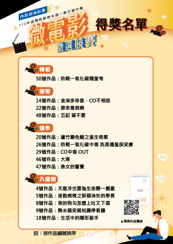 轉知內政部消防署「112年宣導防範熱水器一氧化碳中毒微電影徵選競賽」之得獎名單宣傳圖卡