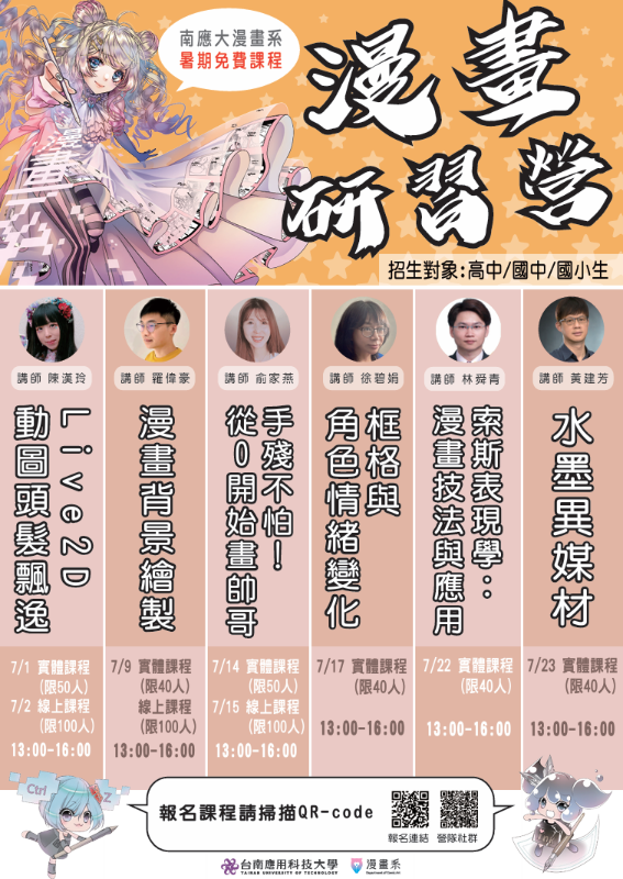 活動介紹:本校漫畫系於2025年暑假期間舉辦「漫畫研習營」免費課程活動,誠摯邀請貴校學生報名參加。本次活動由專業師資團隊精心設計課程,內容豐富多元,旨在培養學生對漫畫藝術的興趣與創作能力。 |