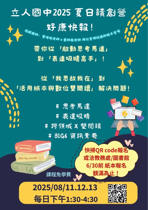 營隊時間:2025年8/11、12、13每日下午1:30-4:30。*(請提前10分鐘報到) 報到地點:立人國中視聽教室(學務處旁) * (帶環保杯、筆) 授課講師:曾培祐老師 x 童師薇老師 兩位重磅級講師聯手登場! 帶你從「啟動思考馬達」到「表達吸睛高手」! 從「我思故我在」到「活用紙本與數位雙閱讀」解決問題! ※