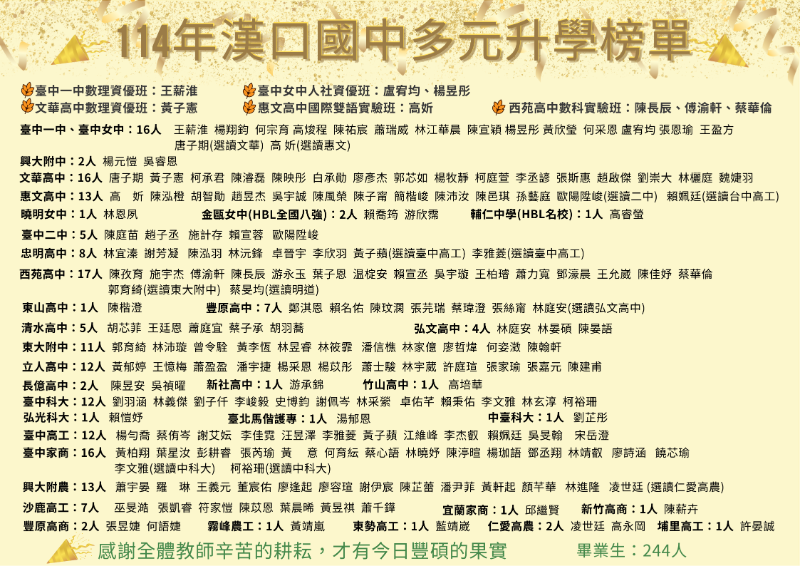 | 標題 | 114學年度漢口國中多元升學榜單 |