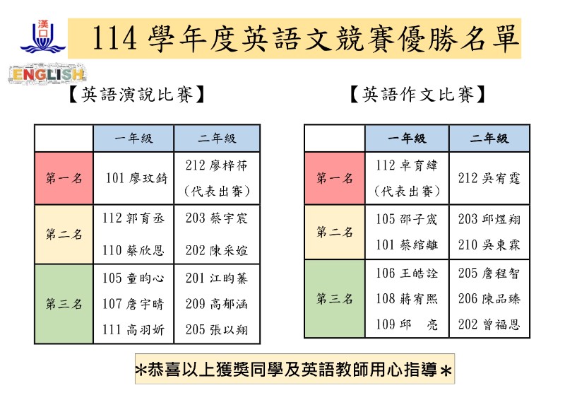 114學年度英文競賽優勝名單~恭喜榮獲比賽的優秀同學
