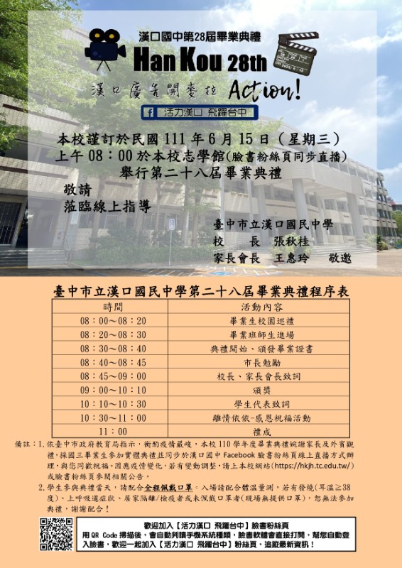 六、注意事項: (一)依臺中市政府教育局指示,衡酌疫情嚴峻,本校110學年度畢業典禮婉謝家長及外賓觀禮,採國三畢業生參加實體典禮並同步於漢口國中Facebook臉書粉絲頁線上直播方式辦理,與您同歡祝福。因應疫情變化,若有變動調整,請上本校網站(https://hkjh.tc.edu.tw/)或臉書粉絲頁參閱相關公告。 (二)本校依市府規範調整畢業典禮辦理方式,一、二年級各班正常上課,有課務之三年級導師,由教務處排代,歡迎無課務的教師前來觀禮。 (三)學生參與典禮當天,請配合全程佩戴口罩。入場請配合體溫量測,若有發燒(耳溫≧38度)、上呼吸道症狀、居家隔離/檢疫者或未佩戴口罩者(現場無提供口罩),恕無法參加典禮,謝謝配合! |