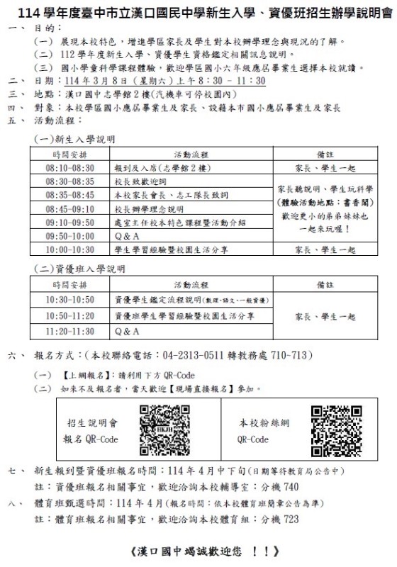 | 標題 | 114學年度新生入學暨資優班招生辦學說明會 |