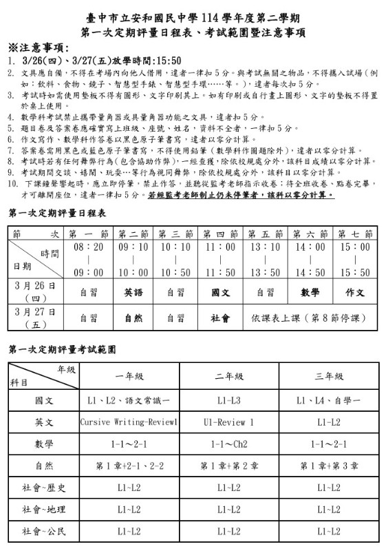 114-2第一次定期評量日程表、考試範圍暨注意事項
