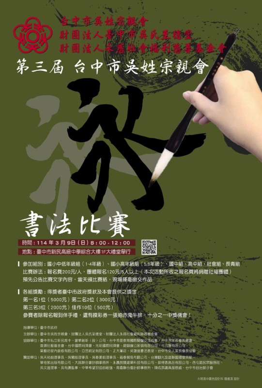 (五)參赛作品:得獎人作品恕不退件,版權歸吳姓宗親會所有,並有刊印、展覽之權利。