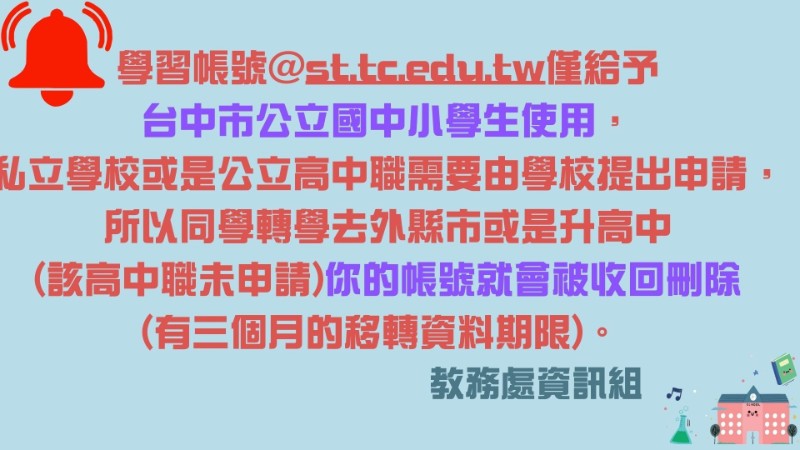 新版規範整併行政帳號與學習帳號管理,並明訂服務用途僅供校務行政及教育學習使用,且新增帳號停權機制(90 日停權、120 日刪除)、空間使用上限(教職員 30G、學生 20G)及申復流程等內容;相關異同比較如附件對照表(附件2) 原「學習帳號使用規範」(@st.tc.edu.tw)肇訂於 111 年 5 月 17 日,因部分條文已不符現行帳號管理政策及服務運作需求,爰自本公告日起廢止之。 |