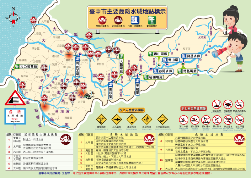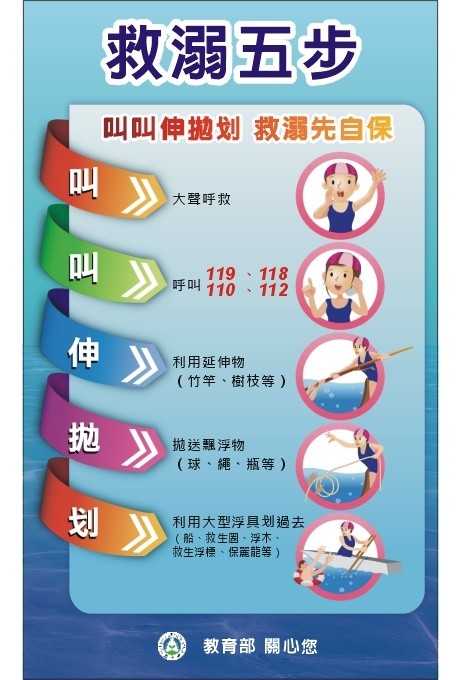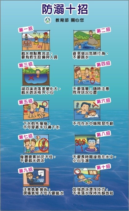 | 標題 | 假期將近,請全校師生從事水域活動時務必注意水域安全,提供「台中市危險水域」、「防溺10招」、「救溺5步」等資訊,大家共同注意。 |