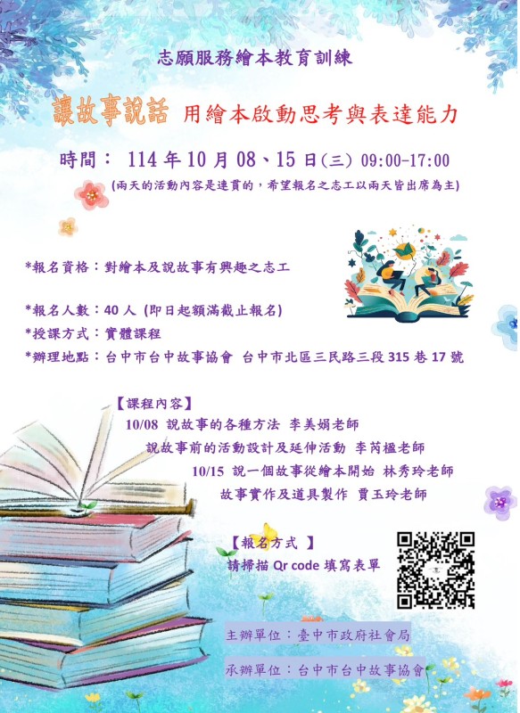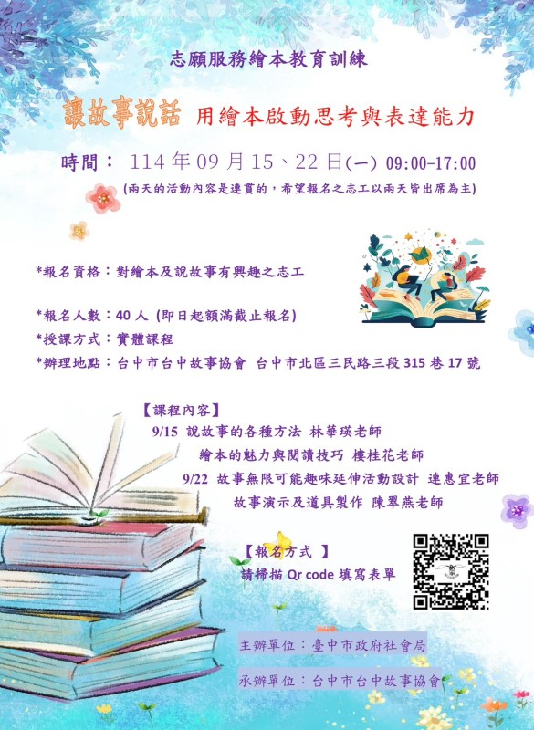 一、依據社會局114年6月25日中市社團字第1140095124號函辦理。二、為鼓勵志工運用志願服務AI繪本,提升繪本應用及培養口語表達、故事創作之能力,融入志願服務,社會局委託台中市台中故事協會辦理旨揭訓練。三、檢附第1梯次報名簡章及第2梯次報名簡章各1份。四、本案如有疑問請洽台中市台中故事協會,電話:04-22344422。
