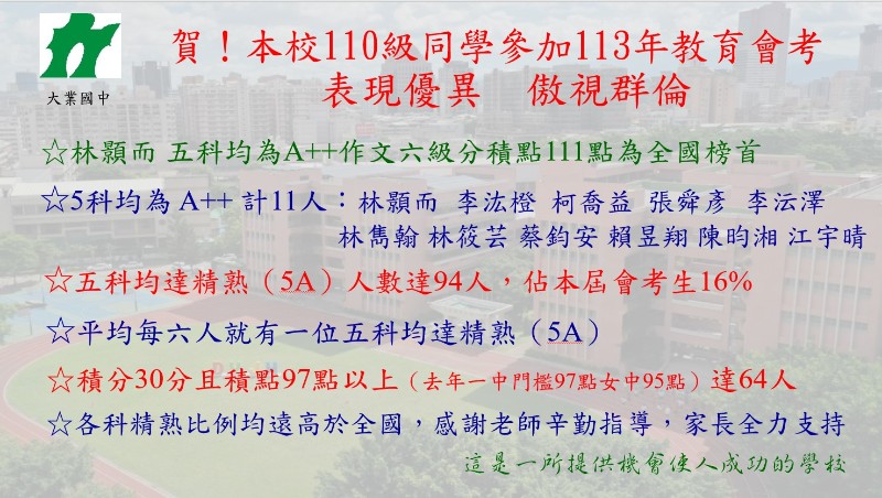 | 標題 | 賀!本校110級同學參加113年會考表現精彩,傲視群倫! |