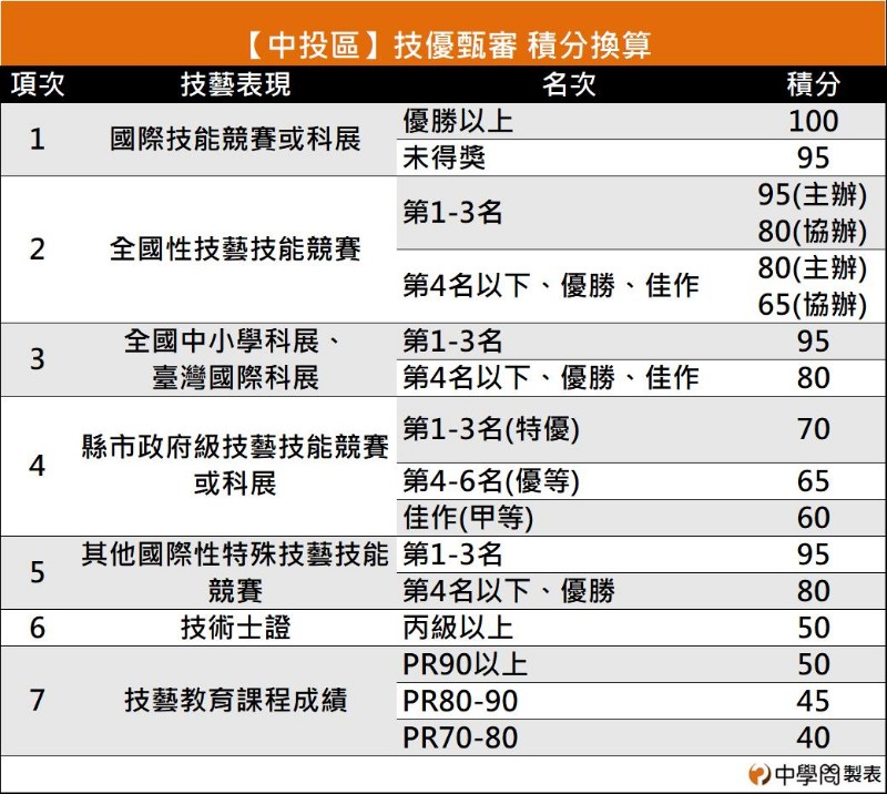 技藝技能優良的國中畢業生,不管是應屆或非應屆,皆可用「技優甄審」這個管道升學就讀相關對應的專業群科。只要你國中就讀期間曾於技藝技能競賽獲獎,或取得技術士證,或是技藝教育課程成績優良(PR70以上,限應屆畢業),皆可報名「中投區」的「技優甄審」。每人限填一科,可一校或多校,最多15志願。
